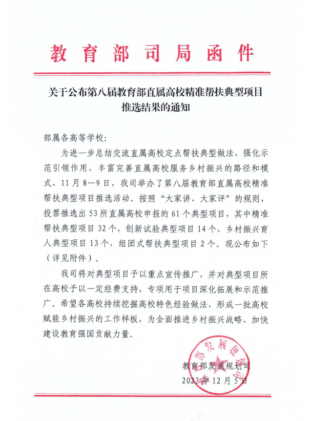 近日,教育部公布了第八屆教育部直屬高校精準幫扶典型項目推選結果,重慶大學報送以及參加的3案例全部入選。入選項目數與另一高校并列第一。